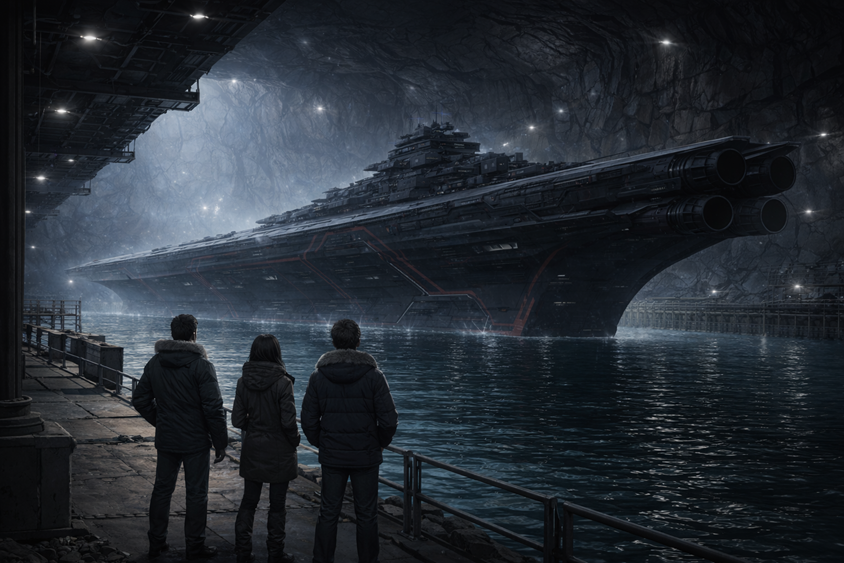 O casco era majoritariamente negro, um negro que engolia luz. Nas laterais, detalhes vermelhos cortavam a superfície como veias. E uma linha dourada corria com precisão, marcando o que não era só nave: era trono. Era símbolo. Era comando.