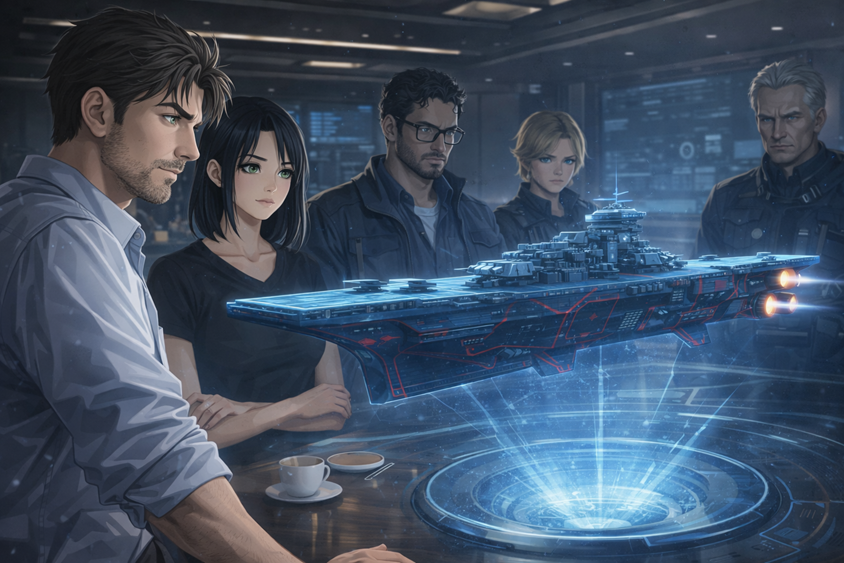 Iara tocou a mesa e a tela projetou imagens rápidas: estruturas que não eram humanas, linguagem geométrica, uma nave atravessando atmosfera e mar como se fossem o mesmo elemento.