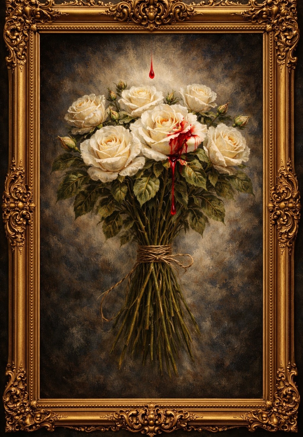 Vermelha como grito, viva como o instante que antecede a queda. Ela desce do alto e encontra uma rosa. Apenas uma. E ali se desfaz em impacto silencioso. Mancha as pétalas alvas, escorre entre as curvas delicadas, é como se a flor a desejasse, absorvendo lentamente a gota de sangue.