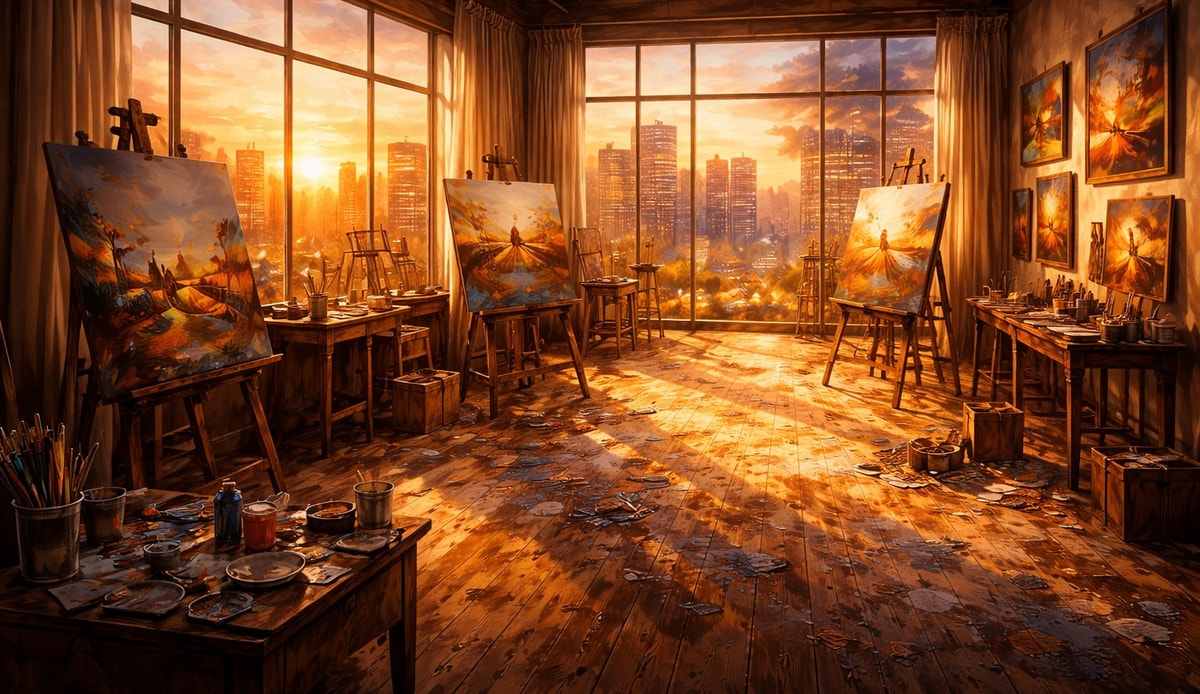 Ao abrir a porta, o sol poente invade o espaço com uma luz morna. Nem clara, nem escura. O ateliê tinha uma parede inteira de vidro, de frente a porta, por onde a luz entrava e se espalhava como pinceladas douradas sobre o chão e as telas. As outras paredes, fechadas, mergulhavam em sombras.